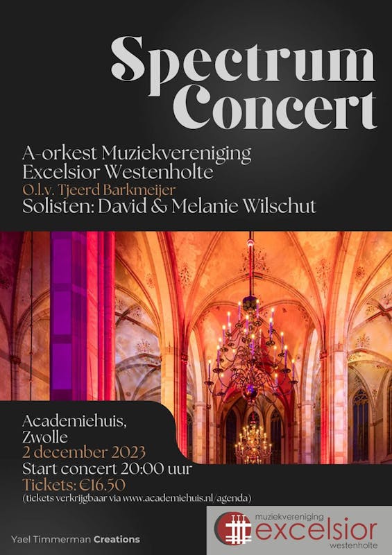 Zaterdag 2 december geeft Muziekvereniging Excelsior Westenholte samen met de solisten David Wilschut (saxofonist) en Melanie Wilschut-Brethouwer (zang en piano) een prachtig concert in het Academiehuis in Zwolle. Tijdens deze avond word je meegenomen in een doorlopend programma van afwisselende muziekstijlen. Van klassiek tot jazz en alles wat daartussen zit. De muziek zal schitterend tot zijn recht komen in de akoestiek van het Academiehuis. Het Spectrumconcert begint om 20:00 uur. Kaarten zijn te koop via de website van het Academiehuis of aan de kassa.