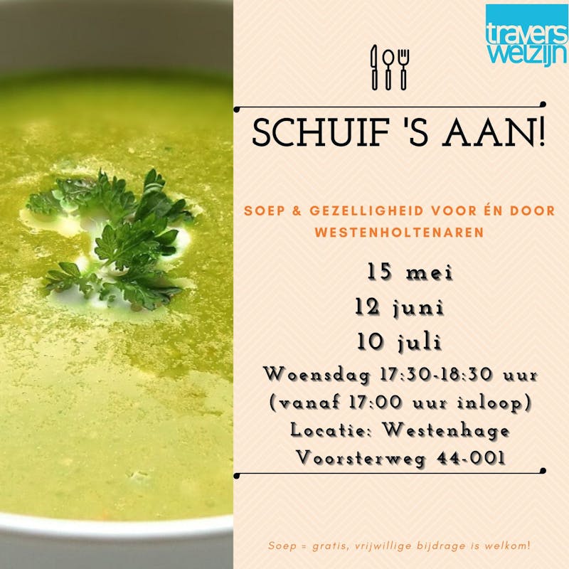 Kom gezellig soep eten met je buurtgenoten! Aanmelding is niet nodig. Inloop vanaf 17.00 uur.