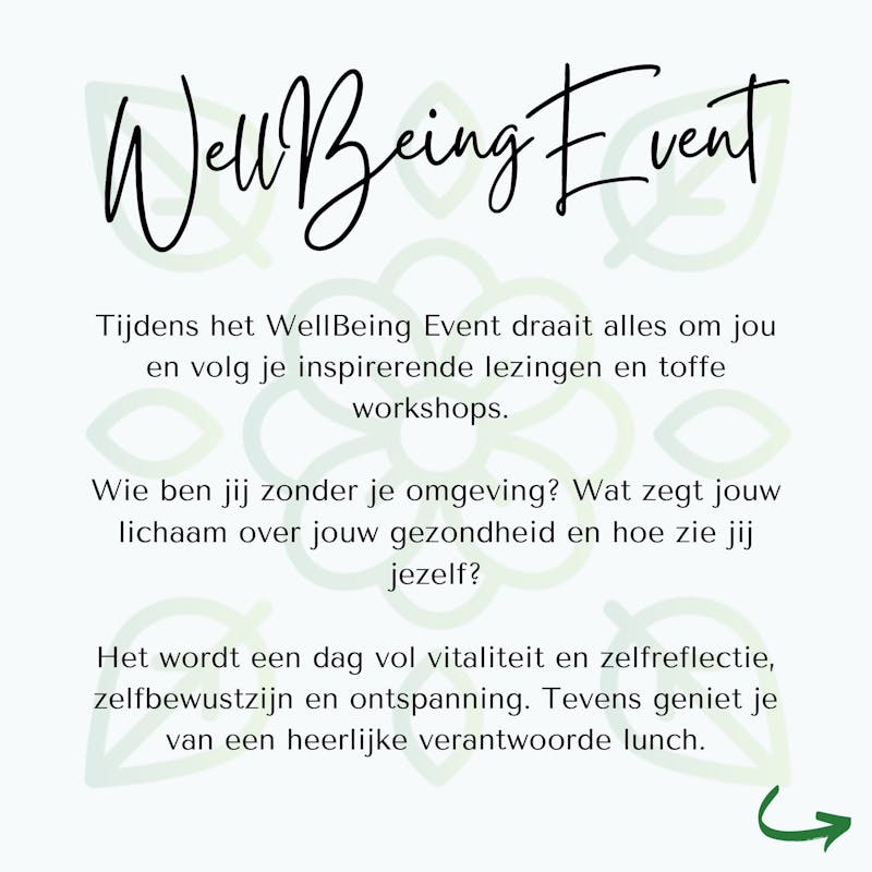 Wie ben jij eigenlijk zonder je omgeving? Wat zegt jouw lichaam over jouw gezondheid en hoe zie jij jezelf? Tijdens het WellBeing Event volg je inspirerende lezingen en toffe workshops waarbij je geïnspireerd wordt om op een andere manier naar je zelf te kijken. Het wordt een dag vol vitaliteit en zelfreflectie, zelfbewustzijn en ontspanning.