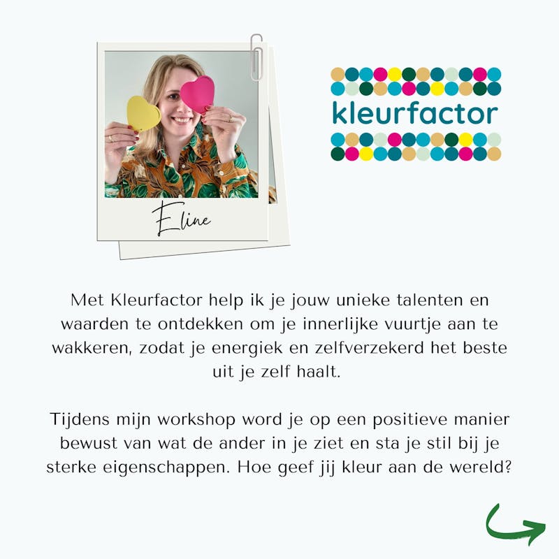 Ik (Eline) laat je tijdens de workshop 'kleur jouw kracht' ervaren hoe bijzonder jij bent. Via leuke oefeningen met kleur leer jij jezelf beter kennen. Zo maak je makkelijker keuzes die bij jou passen om vitaal jezelf te zijn. Hoe geef jij kleur aan de wereld?