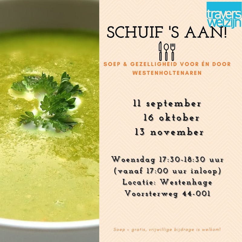 Samen gezellig soep eten met je buurtgenoten. Een keer per maand op woensdag. Schuif jij ook een keer aan? 11 september, 16 oktober, 13 november.