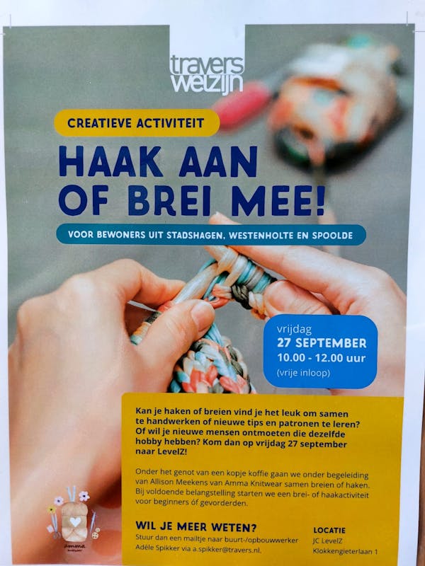 Wil je eens samen met anderen haken of breien? Wat uitwisselen of gewoon voor de gezelligheid? Kom vrijdagmorgen langs! Je kunt meenemen als je met iets bezig bent of ter plekke met iets beginnen.
