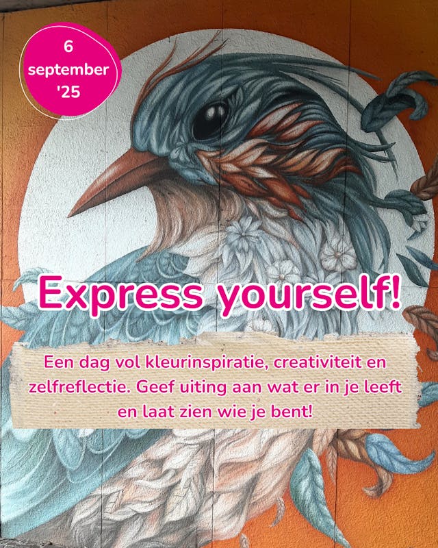 Ben je gek op kleur? Heb je zin in een gezellige, creatieve dag waarin je ook meer over jezelf ontdekt? Dan is de inspirerende Express yourself dag iets voor jou! Geef uiting aan wat er in je leeft en laat maar zien wat voor leuk mens je bent!