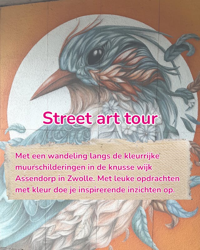 Street art tour: Een wandeling langs de kleurrijke muurschilderingen in de knusse wijk Assendorp in Zwolle. Met leuke opdrachten met kleur doe je inspirerende inzichten op.