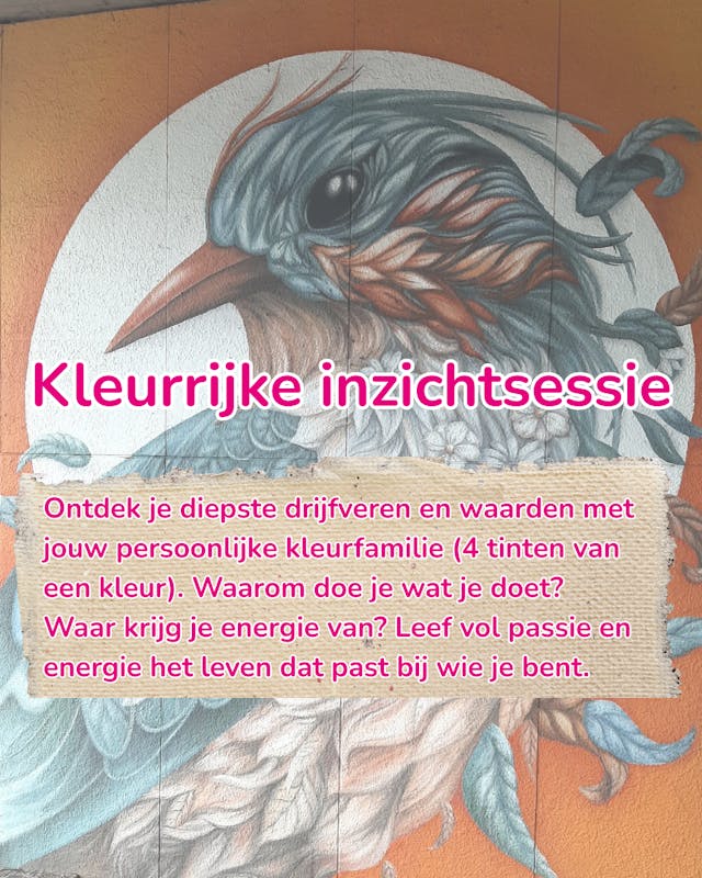 Inzichtsessie met kleur: Ontdek je diepste drijfveren en waarden met jouw persoonlijke kleurfamilie (4 tinten van een kleur). Waarom doe je wat je doet? Waar krijg je energie van? Leef vol passie en energie het leven dat past bij wie je bent.