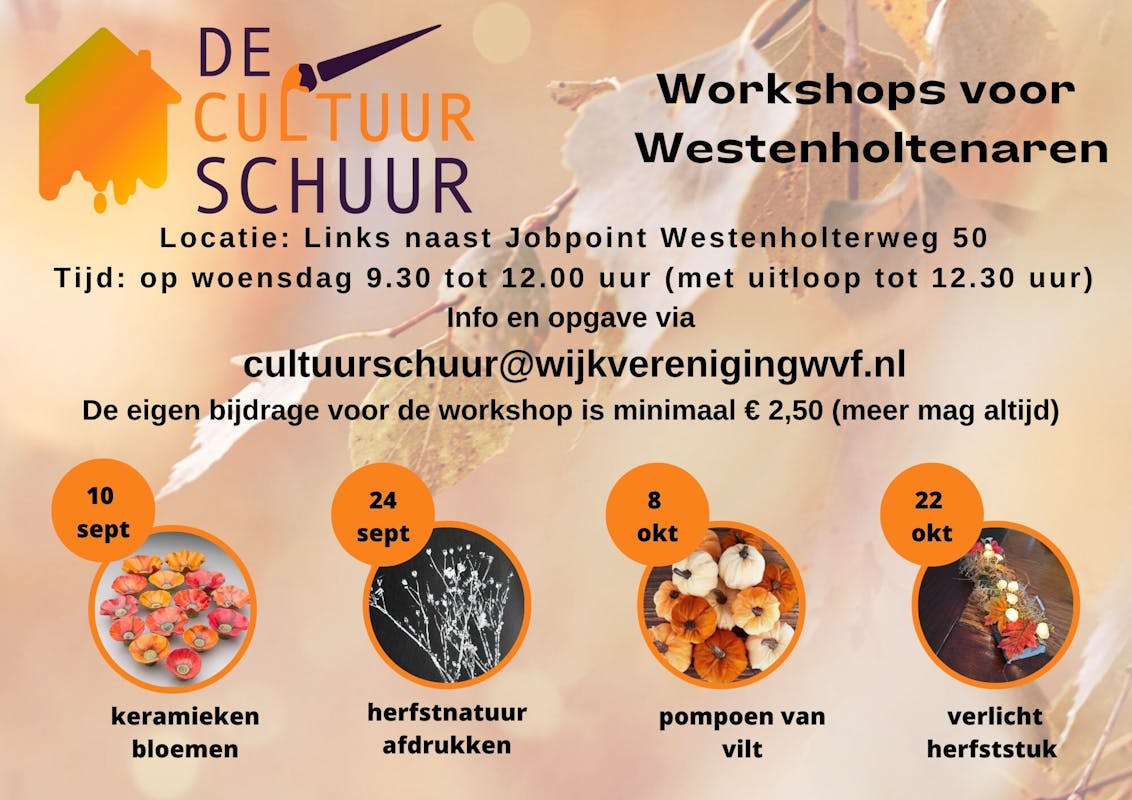 Geef u bij tijd op per mail Werkgroep Cultuurschuur : De eigen bijdrage voor de workshop is minimaal € 2,50 (meer mag altijd)