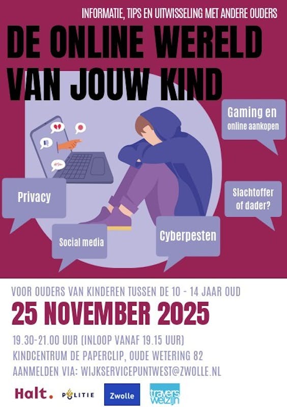 Tijdens deze avond krijgt u concrete handvaten om uw kind te begeleiden in het gebruik van social media. Ook is er ruimte om ervaringen uit te wisselen met andere ouders. Kortom, een waardevolle avond vol praktische tips, inzichten en herkenbare voorbeelden die u helpen om samen met uw kind veilig en bewust online te zijn.