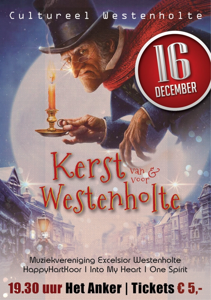 Op vrijdag 16 december komt het bekende kerstverhaal van Charles Dickens ‘A Christmas Carol‘ tot leven in Westenholte. Het verhaal over de oude en verbitterde vrek, Ebenezer Scrooge, die in de nacht voor Kerstmis een aantal dromen heeft en daardoor tot inkeer komt. Initiator Muziekvereniging Excelsior Westenholte brengt in samenwerking met spelers van toneelgroep “De Voorst”, Gospelkoor “One Spirit”, Mannenkoor “Into my Heart” en Dameskoor “HappyHartKoor” een kerstconcert rondom dit bekende kerstverhaal.