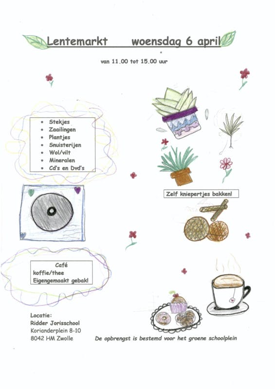 Op woensdag 6 april wordt er op Vrije School Ridder Joris een lentemarkt gehouden van 11.00 tot 15.00 uur. De opbrengst is bestemd voor het groene schoolplein.
