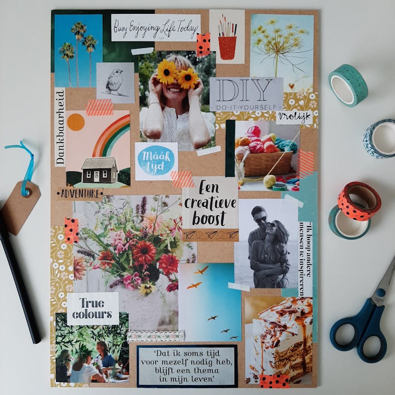 Pak even een moment voor jezelf! Tijdens deze workshop maak je op een ontspannen en creatieve manier zichtbaar waar jouw persoonlijke kracht ligt. We starten met een visualisatie waarin jij jouw ideale zelf in beeld brengt. Samen gaan we op zoek naar de kleur die jij verbindt aan de beste versie van jezelf met de bijbehorende balanskleur. Vervolgens kun je deze kleuren gebruiken in je visionboard, die je maakt op een stevig A3 MDF-plaat. Je knipt en/of scheurt afbeeldingen, quotes en leuke patroontjes uit verschillende tijdschriften. Er liggen allerlei knutselspullen klaar om jouw visionboard zo compleet mogelijk te maken. Je gaat naar huis met een inspirerend bord dat jou helpt om in je dagelijks leven (meer) bewust te zijn van jouw prachtige kracht en om trots te zijn op wie je bent!