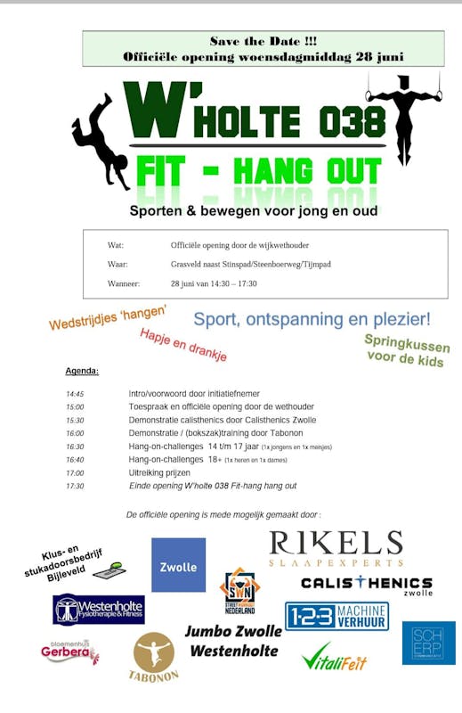 Op woensdag 28 juni volgt dus vanaf 14.30 uur de feestelijke opening. Vanaf die tijd geven Tabanon Zwolle en Calisthenics Zwolle diverse trainingen en demo’s. Maar er is ook een springkussen, er zijn hapjes en drankjes en er zijn zogeheten hang on challenges in de categorieën 14 tot en met 17 jaar en 18 jaar en ouder. De uitreiking van de prijzen van die challenges is om 17.00 uur. Bosscher tot slot: “Het is fantastisch dat we dit kunnen realiseren in Westenholte. Nu is er een mooie mogelijkheid gekomen om gratis te sporten, voor jong en oud.”
