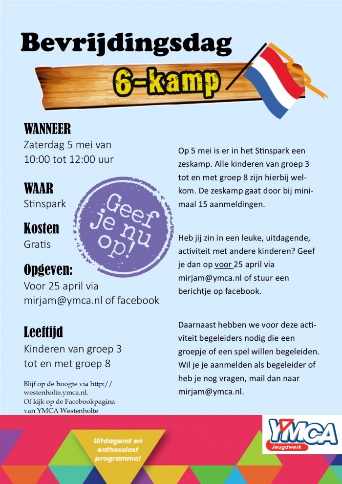 Om te weten wat wij kunnen verwachten werken wij deze activiteit met opgave. Opgeven kan via of via https://www.facebook.com/ymcawestenholte/. Je kunt je opgeven tot 25 april.