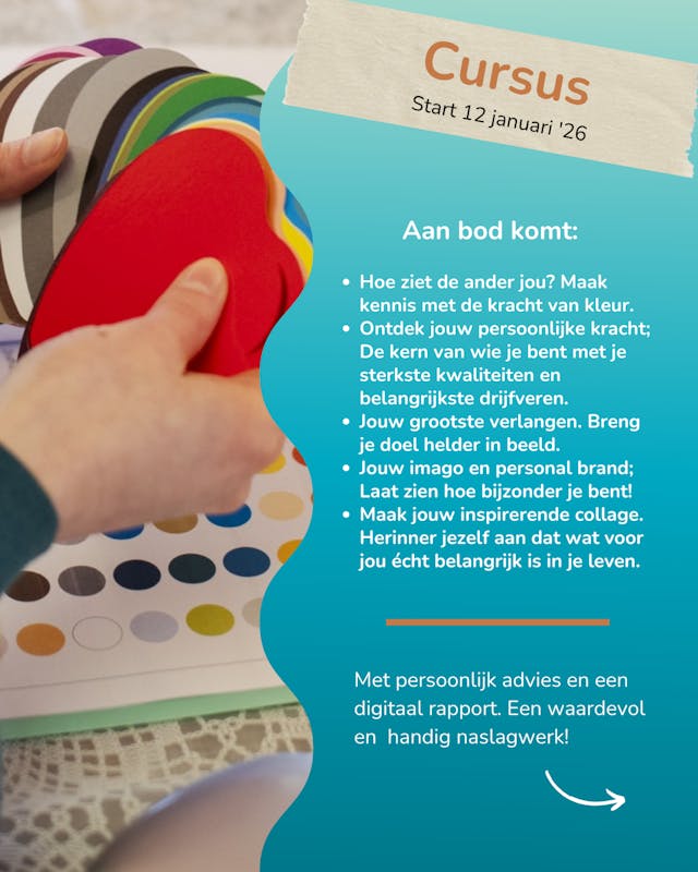 Tijdens deze cursus krijg je verrassende inzichten in jezelf aan de hand van de kleurenpsychologie. Samen brengen we jouw kwaliteiten kleurrijk in beeld en ontdek je hoe je jouw persoonlijke kracht optimaal kunt benutten. Daarnaast werk je aan balans in je leven en aan het presenteren van jezelf op een manier die past bij jouw unieke persoonlijkheid, geeft Bijzet aan. Je ontvangt een digitaal rapport vol waardevolle inzichten en praktische tips: een handig naslagwerk om jouw persoonlijke groei ook na de cursus voort te zetten.