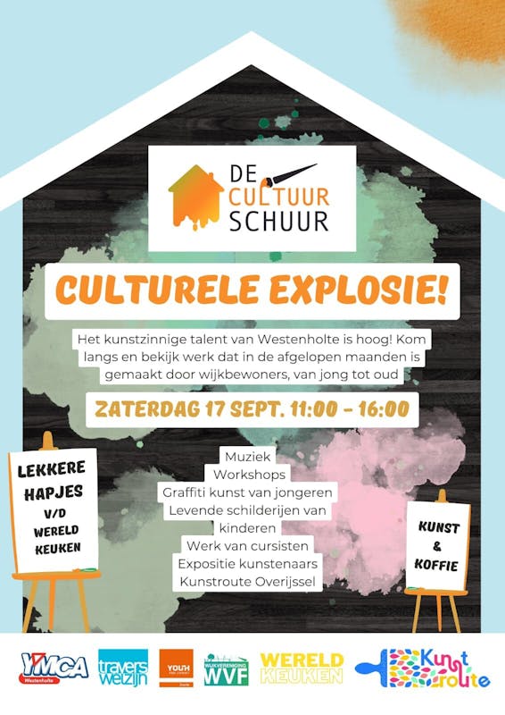 Een bijzondere dag in Westenholte, vol met kunst en cultuur. Buurtbewoners tonen hun kunsten, deels gemaakt tijdens de activiteiten en workshops in de Cultuurschuur. Er zijn workshops, koffie en kunst, gezellige wijkbewoners, kortom, geen goed excuus om NIET te komen ;-)