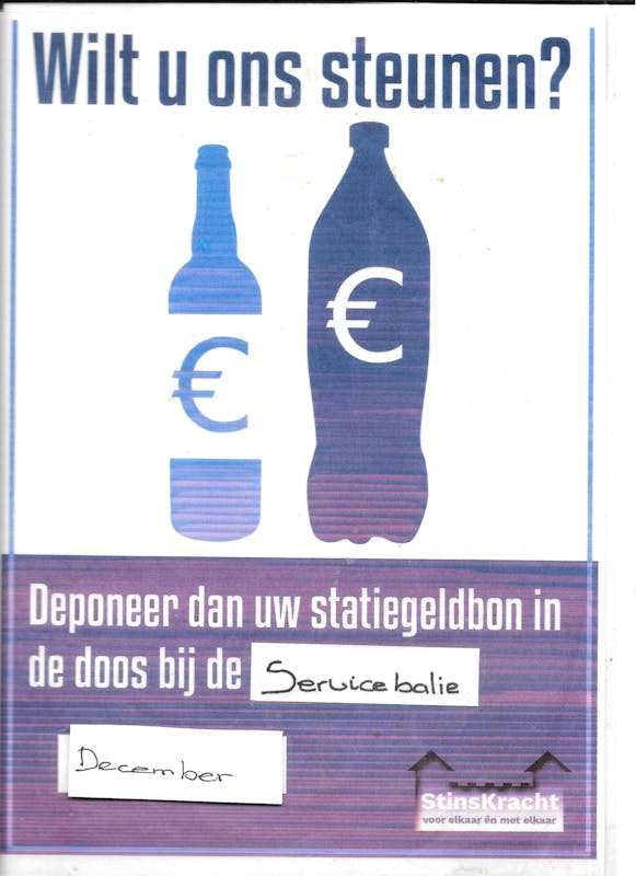 Ook dit jaar kunt u weer uw statiegeldbonnetjes inleveren bij de Jumbo op het Petuniaplein en hiermee een donatie doen aan Stinskracht. Hiermee kunnen we weer activiteiten doen in de wijk.