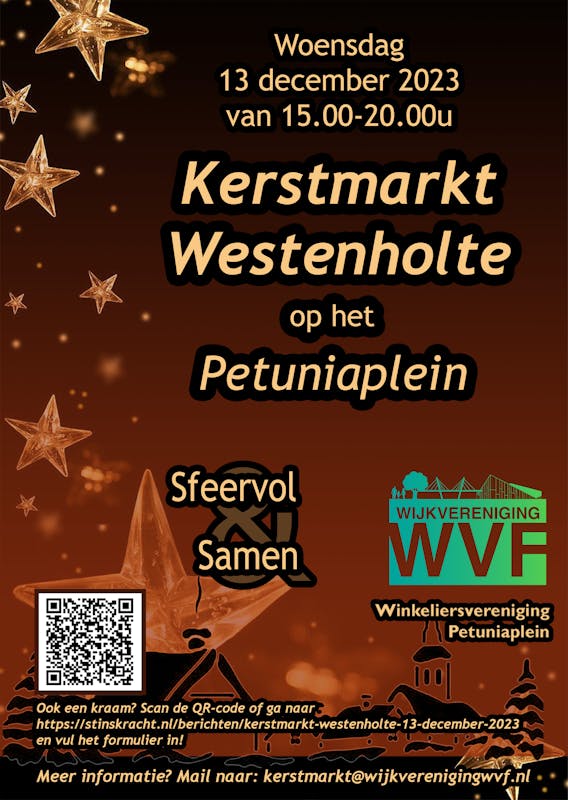 Het is een traditie op de tweede woensdag van december: Kerstmarkt op het Petuniaplein in Westenholte. Op 13 december vanaf 15.00u is het petuniaplein omgetoverd tot een sfeervolle kerstmarkt. Breng je huis in kerstsferen met de aangeboden, al dan niet zelfgemaakte, kerstartikelen. Omdat zo’n kerstmarkt natuurlijk hongerig maakt, is er een groot aanbod aan hapjes en drankjes. Tot slot heeft zelfs de kerstman toegezegd om langs te komen voor de prijsuitreiking van de grote winkeliersactie.