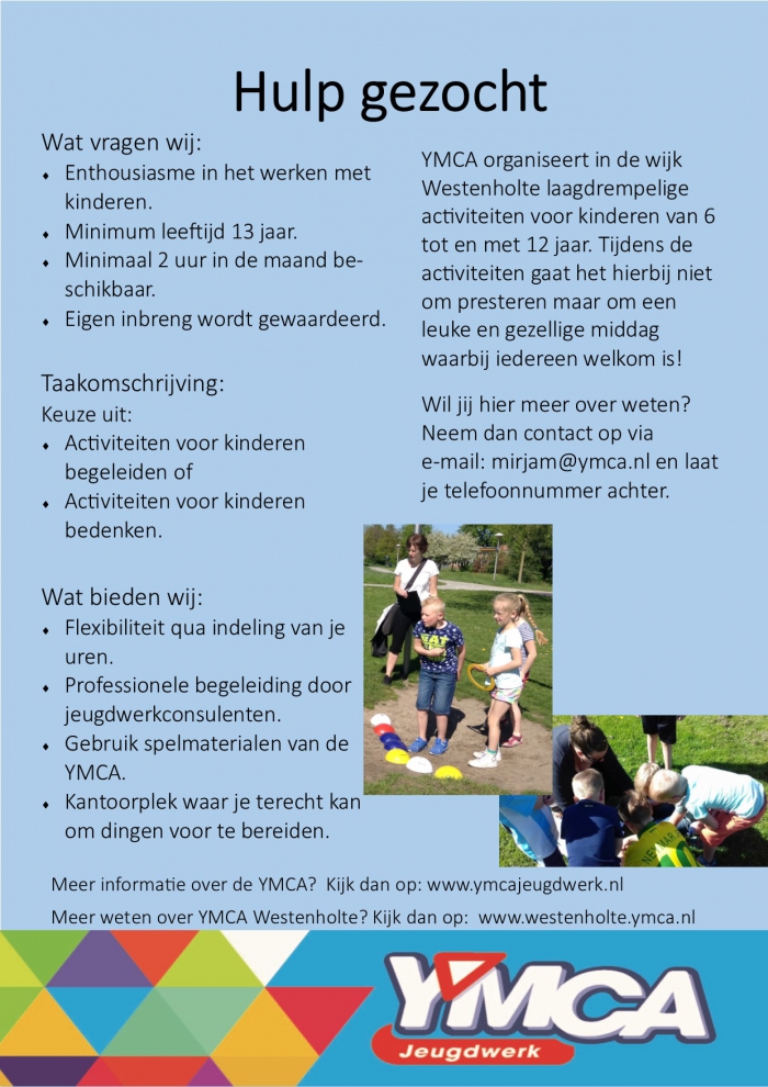 Ken jij iemand die ons minimaal 2uur in de maand kan ondersteunen bij het organiseren of begeleiden van activiteiten voor kinderen in Westenholte? Stuur dan snel onderstaande flyer door naar diegene. Maar natuurlijk mag je zelf ook reageren ????.