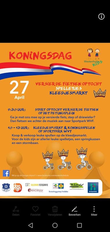 Westenholte Kids (werkgroep kinderactiviteiten WVF) organiseert op Koningsdag weer een versierde fietsenoptocht vanaf het Petuniaplein en aansluitend spelletjes en kleedjesmarkt op sportpark De Weidesteen! Bekijk voor meer info bijgevoegde poster: