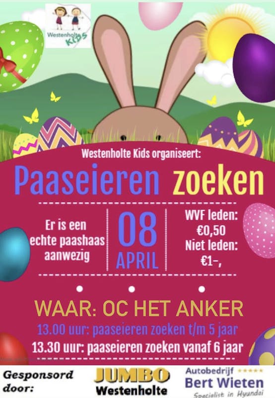 - 13.00 uur: start paaseieren zoeken voor kids t/m 5 jaar