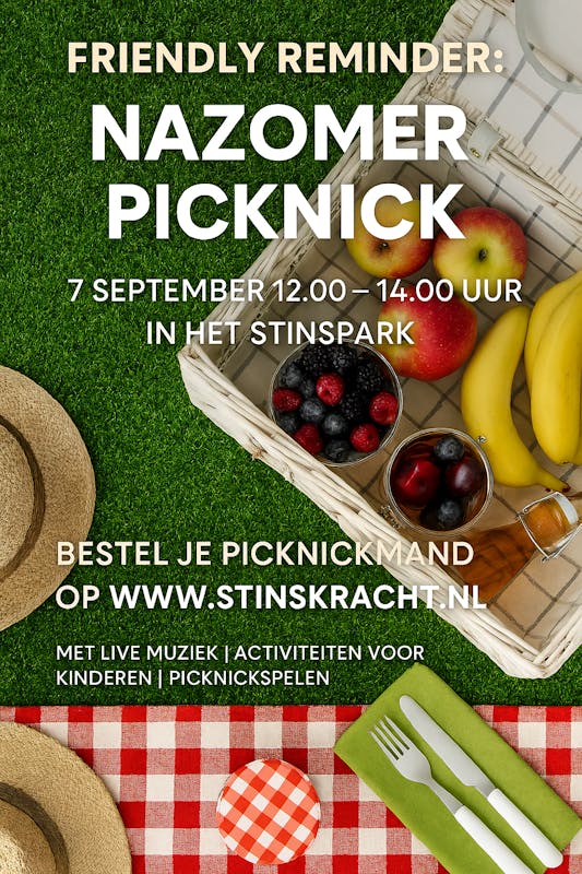 Zondag 7 september komt snel dichterbij! Van 12.00 tot 14.00 uur ben je van harte welkom in het Stinspark voor een gezellige nazomerpicknick met buurtgenoten uit Westenholte.