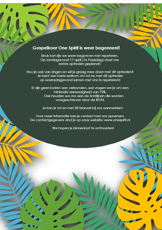 Gospelkoor One Spirit is sinds kort weer begonnen met repeteren. Op zondagavond 17 april (eerste Paasdag) staat ons optreden gepland. Heb je zin om mee te doen? Meld je dan uiterlijk 28 februari bij ons aan! Onze contactgegevens zijn te vinden op onze website: www.onespirit.nl