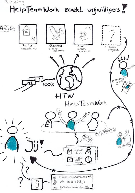 Ben jij een warm en betrokken persoon en wil je graag van betekenis zijn voor een ander? Wij, Stichting HelpTeamWork, zijn op zoek naar enthousiaste vrijwilligers die een bijdrage willen leveren aan het creëren van kansen voor mensen zonder onderwijs, (goed) voedsel en zonder vooruitzichten in het leven. Bekijk onze website voor meer informatie over het werk wat we doen en onze contactgegevens: www.helpteamwork.nl