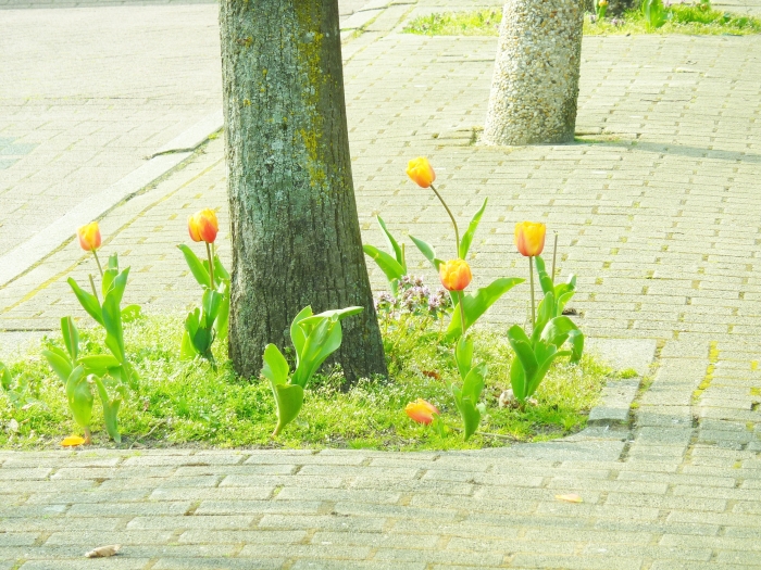 (Henk en Willemien wilden liever niet op de foto en dat respecteren we uiteraard; in plaats daarvan een mooie symbolische foto van de bloeiende tulpen aan het Petuniaplein, waarvan de bollen geplant zijn bij de lancering van StinsKracht, tijdens burendag 2015)