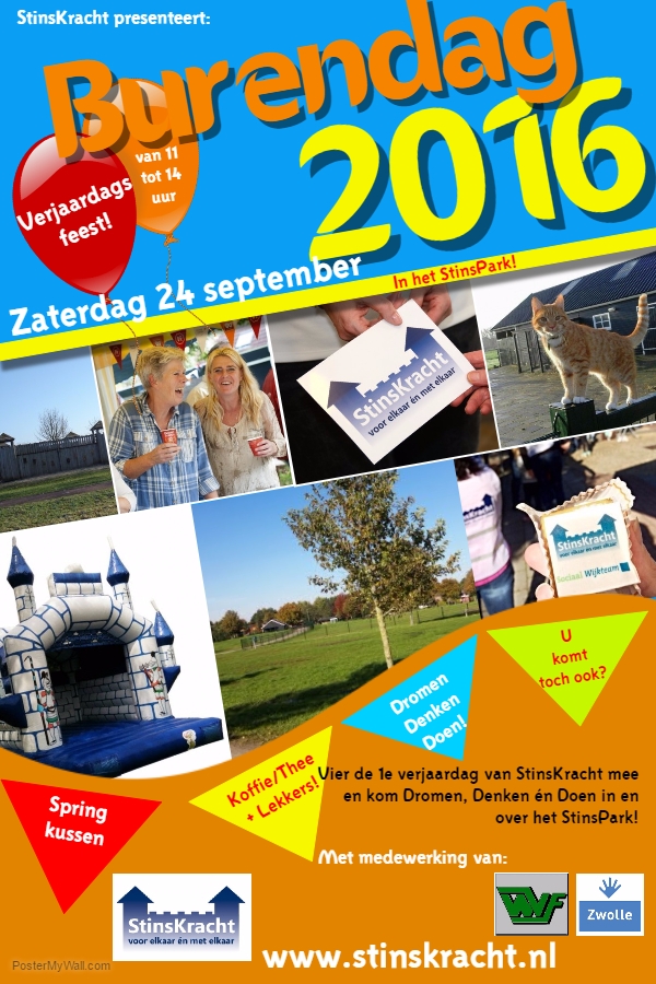 Zaterdag 24 september is het weer Burendag. En dat willen we als StinsKracht graag met al onze buren vieren! Zeker ook omdat het onze 1e verjaardag is; vorig jaar zijn we op Burendag 2015 van start gegaan met de feestelijke opening van ons loket. We nodigen alle bewoners van Westenholte daarom graag uit in het Stinspark om elkaar te ontmoeten en samen onze 1e verjaardag te vieren. Onder het genot van een kopje koffie, thee of ranja met wat lekkers willen we daarnaast met elkaar van gedachten wisselen over onze wijk en alles wat ons daarin bezighoudt. Voor de kinderen is er een springkussen.