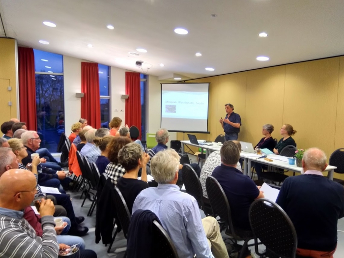 Na het formele gedeelte van de algemene ledenvergadering van de wijkvereniging werd aan leden en belangstellenden een eerste schets /vlekkenplan voor het Stinspark voorgelegd en gepresenteerd door ontwerper Johan Geerdink van Geerdink Tuinen. Daarna gaf stadsarcheoloog van Zwolle Michael Klomp een presentatie over de rijke historie van de parklokatie; over de heren van Voorst en hun Stins(kasteel). Jos Stöver van de Rijksdienst voor cultureel erfgoed gaf met mooie praktijkvoorbeelden inzicht in de mogelijkheden om de geschiedenis van 800 jaar geleden weer zichtbaar en voelbaar te maken in de openbare ruimte.In de volgende Stins uitgebreid aandacht voor de plannen voor het Stinspark, met een toelichting op de 1e schets en een doorkijk van het vervolgproces.