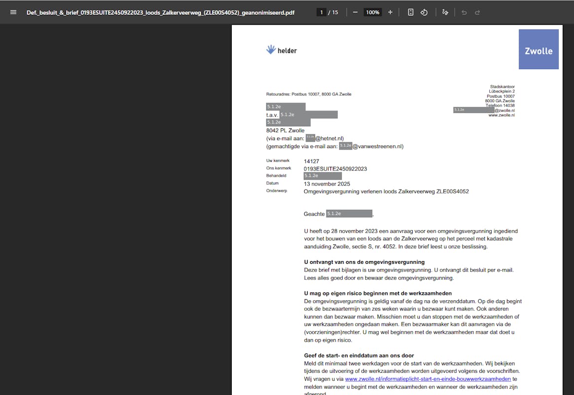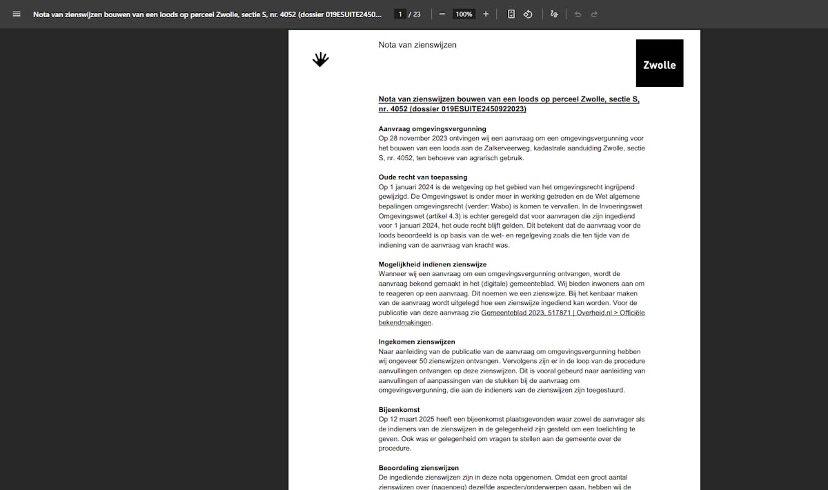 19 november heeft de gemeente Zwolle de aanvraag voor een omgevingsvergunning voor de bouw van een loods in het land rechts van de Zalkerveerweg goedgekeurd. Voor eenieder die hier nog op wil reageren is hier tot 27 december 2025 de gelegenheid toe.