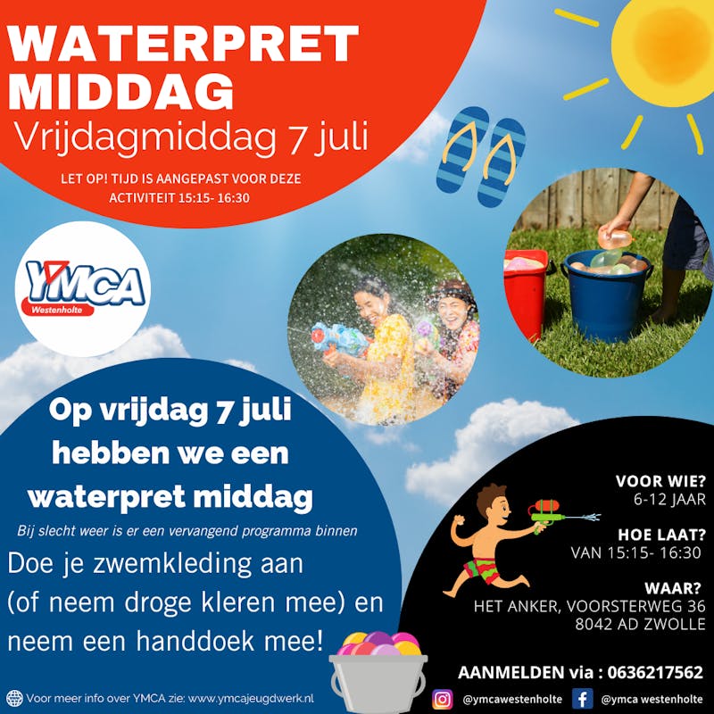 Op vrijdag 7 juli hebben we een hele leuke waterpret middag op de planning staan. We gaan allemaal leuke spellen doen met water! Dus neem droge kleren en een handdoek mee!! 💧☺️Bij slecht weer hebben we een vervangend programma. ☀️⛱️