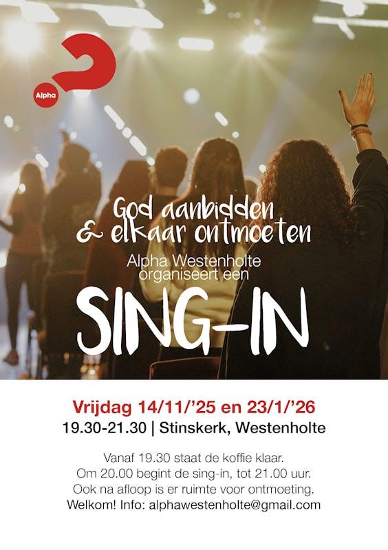 Alpha Westenholte organiseert een sing-in! Doel: God aanbidden, gelegenheid creëren voor gelovigen en daarin geïnteresseerden in Westenholte/Stadshagen (en omgeving!) om elkaar te ontmoeten en kennismaken met het concept Alpha-cursus.